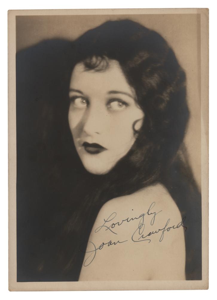 Very early vintage matte-finish 5 x 7 photo from circa 1926, picturing a young Joan Crawford with long brunette hair looking over her shoulder, signed in fountain pen, “Lovingly, Joan Crawford.” In fine condition.