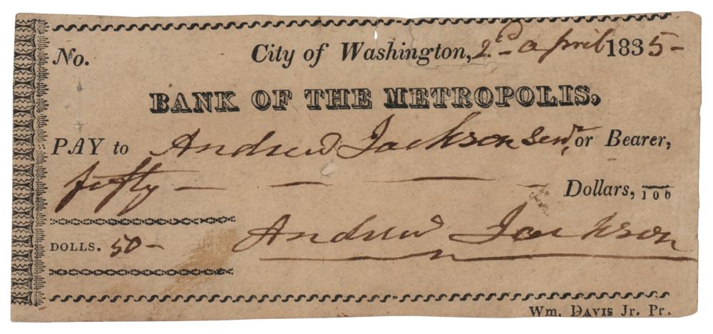 Very rare Bank of the Metropolis check, 4.75 x 2, filled out and signed by Andrew Jackson as president, made payable to "Andrew Jackson, Gen'l" for $50, April 2, 1835. In fine condition. Given the unusual addition of his military rank, this check is ostensibly pension money owed to Jackson for his service in the United States Army.