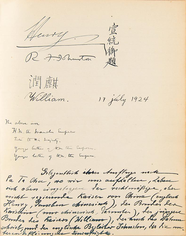 Xuantong Emperor of China, known as Puyi (1906-1967), who served as the 11th and final Qing dynasty monarch. He was known as ‘The Last Emperor’ and was the titular subject of Bernardo Bertolucci’s epic biographical drama film. Vintage red leather-bound autograph album, 8 x 10, containing an extremely rare, bold fountain pen signature of Puyi, the Xuantong Emperor, who has signed with his preferred English name “Henry,” with another hand adding his Chinese signature to the right. Immediately below on the same page are ink signatures of Reginald F. Johnston (1874-1938), a British diplomat who served as tutor and adviser to Puyi, and the Emperor’s younger brother Imperial Prince Pujie (1907-1994), who also signs with both his Western name (“William, 17 july 1924”) and in Chinese characters. English and German annotations below, the former done in the hand of Johnston, identify the signatures as belonging to Puyi and Pujie.