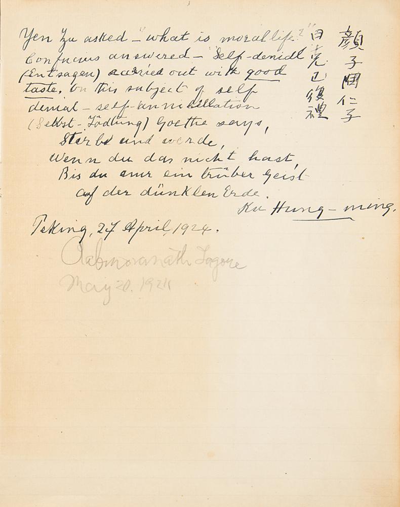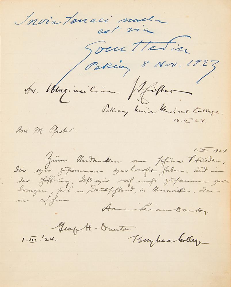Moreover, the album contains over 110 other signatures in ink and pencil, most with additional autograph sentiments, many in German, although also including some entries in Chinese and English. Notable signatories include the Bengali polymath Rabindranath Tagore, who dates his signature to May 20, 1924; famed Swedish geographer, cartographer, and explorer Sven Hedin, who dates his signature to Peking on November 8, 1923; German surgeon and gynecologist Otto Eix; Gu Hongming, a British Malaya-born Chinese man of letters and friend of Leo Tolstoy; Erwin Rouselle, a German sinologist and professor of German philosophy at Peking University; Erwin Liek, a German physician, writer, and founding editor of the general health magazine Hippokrates; Max Halbe, a German dramatist, who was one of the main exponents of Naturalism (2); and Hans Driesch, a German biologist and philosopher, noted for his early experimental work in embryology and for performing the first artificial ‘cloning’ of an animal in the 1880s. The album contains many other signatures, which date between 1923 and 1950. In fine condition, with damage only to the album's spine, not at all affecting any of the clean interior pages. Accompanied by a full letter of authenticity from PSA/DNA.