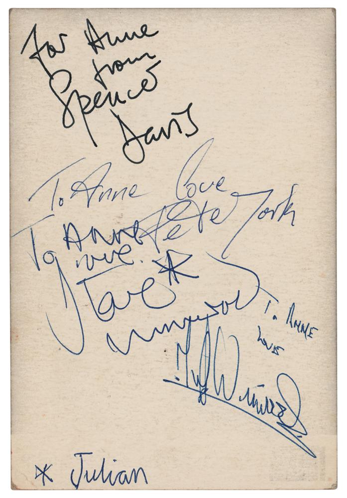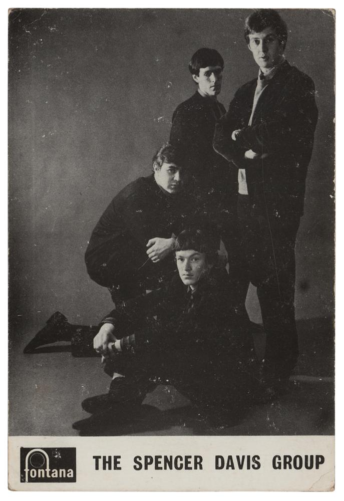 Vintage circa 1960s Fontana Records promo card of the Spencer Davis Group, 4.25 x 6.25, signed on the reverse in ink and ballpoint by Spencer Davis, Steve Winwood, Muff Winwood, and Pete York, with all adding inscriptions to “Anne.” In fine condition, with light scuffing to the image side. Accompanied by a certificate of authenticity from Tracks.