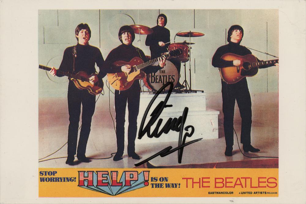 Color glossy 6 x 4 Metro Music postcard promoting the Beatles movie HELP!, signed on the front in black felt tip, “Ringo.” The consignor notes that the autograph was obtained in 2004 when the recipient wrote to Ringo at his Surrey home. In fine condition. Accompanied by a certificate of authenticity from Tracks.