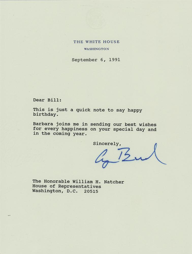 TLS as president, one page, 6.75 x 9, White House letterhead, September 6, 1991. Letter from George Bush to longtime Kentucky Congressman William Natcher, in full: “This is just a quick note to say happy birthday. Barbara joins me in sending our best wishes for every happiness on your special day and in the coming year.” In very fine condition, with very faint haloing to the signature.