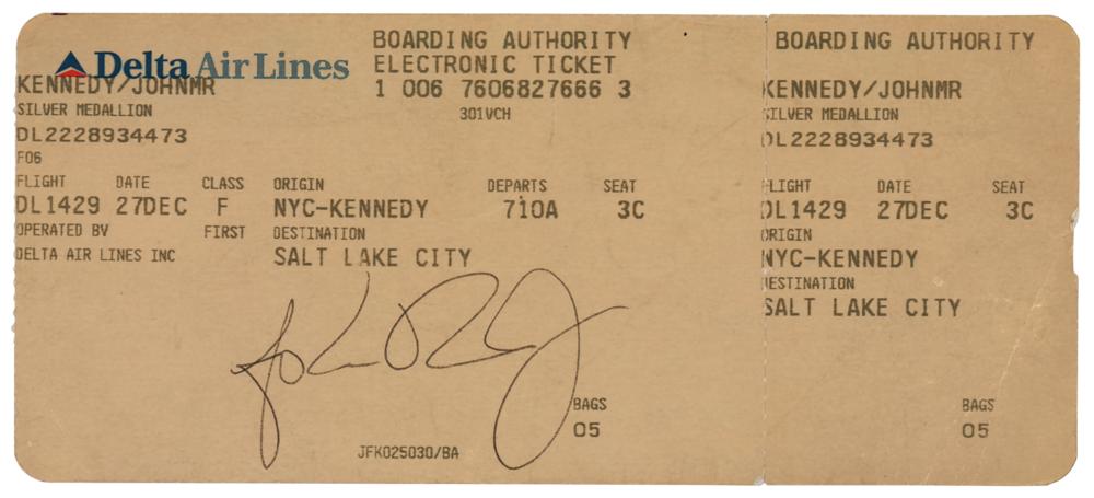 Boarding ticket for a Delta Airlines flight from New York’s John F. Kennedy International Airport to Salt Lake City International Airport on December 27 [no year], 7.25 x 3.25, issued to “Kennedy / John Mr” as a silver medallion member, signed below in black ballpoint, “John F. Kennedy, Jr.” In very good to fine condition, with some creasing and handling wear.