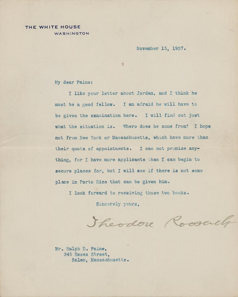 TLS as president, one page, 7 x 8.75, White House letterhead, November 15, 1907. Letter to noted journalist and author Ralph Delahaye Paine, who later served as a New Hampshire congressman, in full: “I like your letter about Jordan, and I think he must be a good fellow. I am afraid he will have to be given the examination here. I will find out just what the situation is. Where does he come from? I hope not from New York or Massachusetts, which have more than their quota of appointments. I can not promise anything, for I have more applicants than I can begin to secure places for, but I will see if there is not some place in Porto Rico that can be given him. I look forward to receiving those two books.” In fine condition.