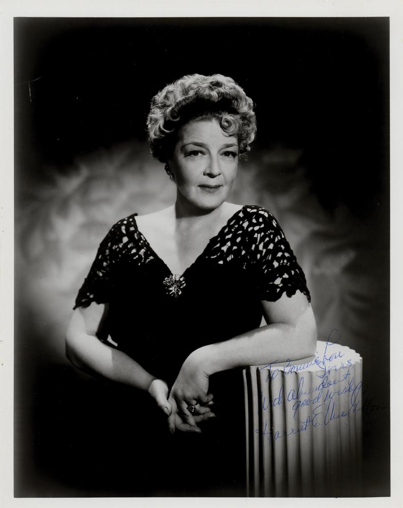 Film, stage, and television actress (1905-1987) best known for her role as the insufferably snobbish, 'blue-blooded Bostonian' Mrs. Margaret Drysdale in the sitcom The Beverly Hillbillies. Scarce vintage glossy 8 x 10 photo of the actress in a lovely half-length pose, signed and inscribed in blue ballpoint "To Bonnie Lou Ivers, with abundant good wishes, Harriet MacGibbon.” In fine condition, with staple holes along the extreme left edge. MacGibbon's autograph is scarce in any form, this being the first signed photo we have offered in over two decades.