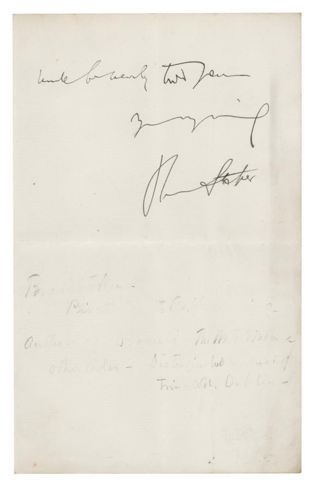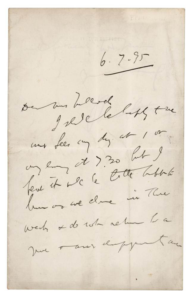 ALS, two pages on two adjoining sheets, 5 x 8, blindstamped Lyceum Theatre letterhead, July 6, 1895. Handwritten letter arranging an appointment, in part: "I should be happy to see Mr. Lees any day at 1 or any evening at 7:30 but I fear it will be?here as we close in three weeks & do not return for a year & have engagements?for nearly two years." In very good to fine condition, with intersecting folds and overall creasing.