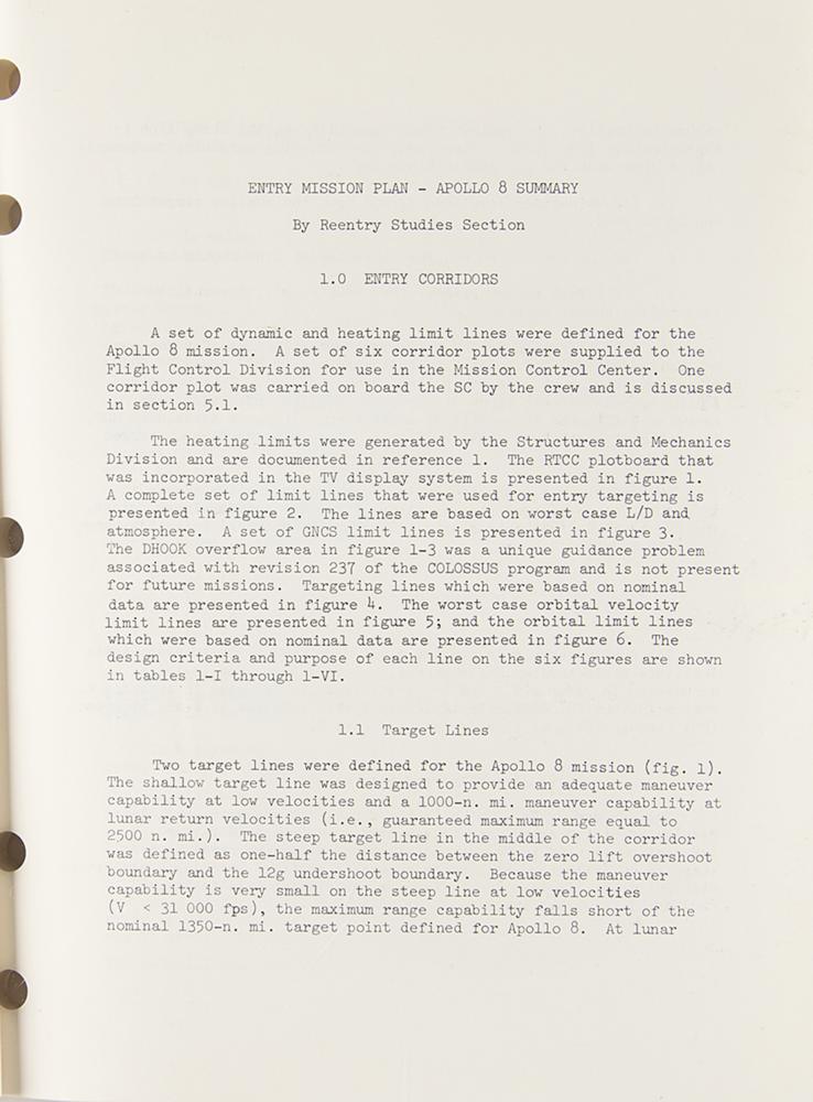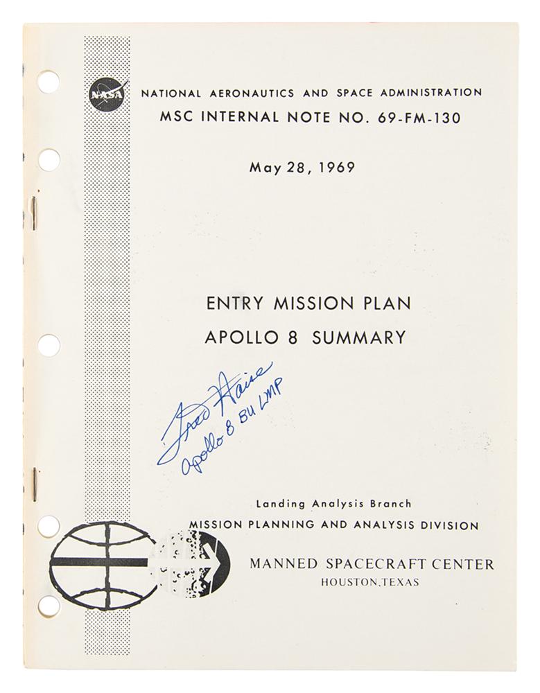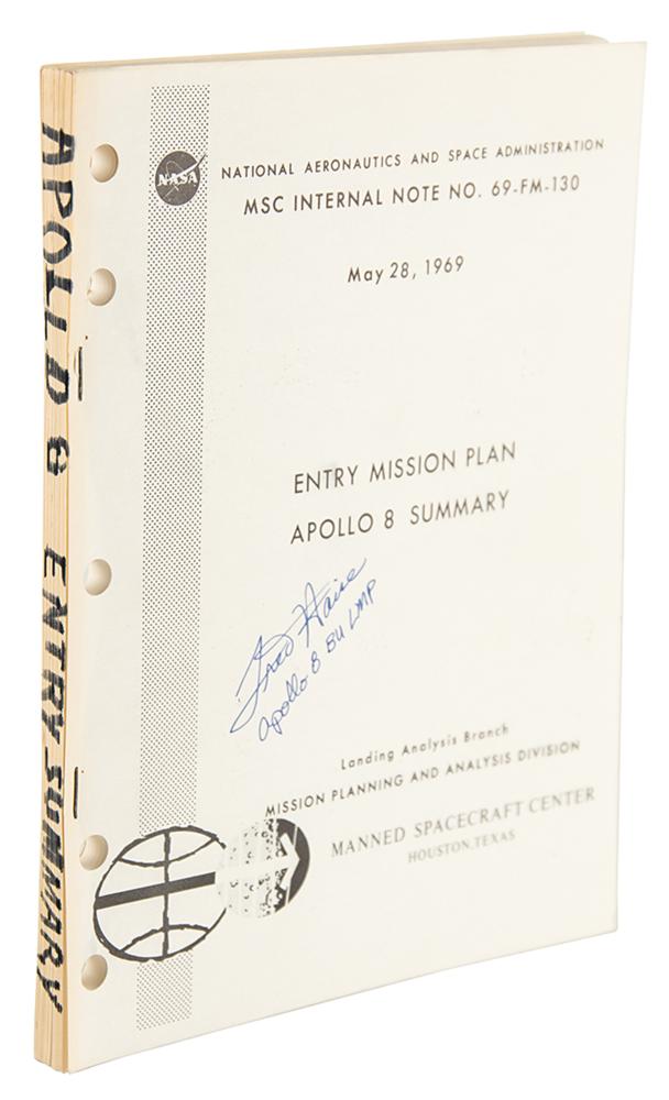 Official stapled NASA manual entitled “Entry Mission Plan, Apollo 8 Summary” (MSC Internal Note No. 69-FM-130), 172 pages, 8 x 10.5, dated May 28, 1969, prepared by the Landing Analysis Branch, Mission Planning and Analysis Division. Signed on the front cover in felt tip, “Fred Haise, Apollo 8 BU LMP.” The textblock is marked in bold black felt tip: “Apollo 8 Entry Summary.” The manual’s foreword reads, in part: “During the permission planning for the Apollo 8 mission, a total of approximately 50 memorandums and internal notes were published?The purpose of this document is to summarize the more important of these documents so that future flight crews will benefit from the Apollo 8 work.” In fine condition.