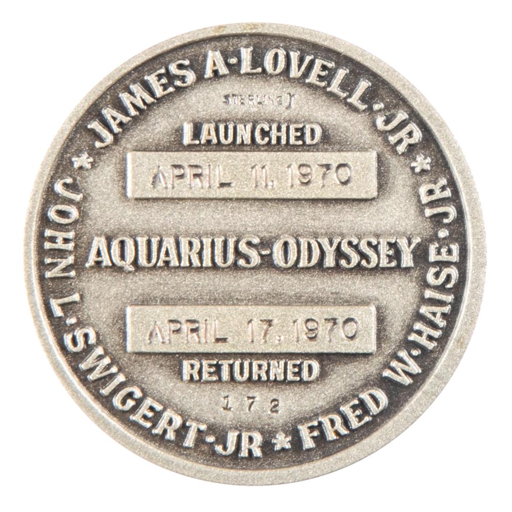 Fred Haise's flown sterling silver Apollo 13 Robbins medal with a raised design of the mission insignia on the face, approximately 1.25″ in diameter, engraved on the reverse with the launch date of April 11, 1970, and the return date of April 17, 1970, encircled by the names of the astronauts in raised text, with serial number, "172," engraved below. Condition is mint state.