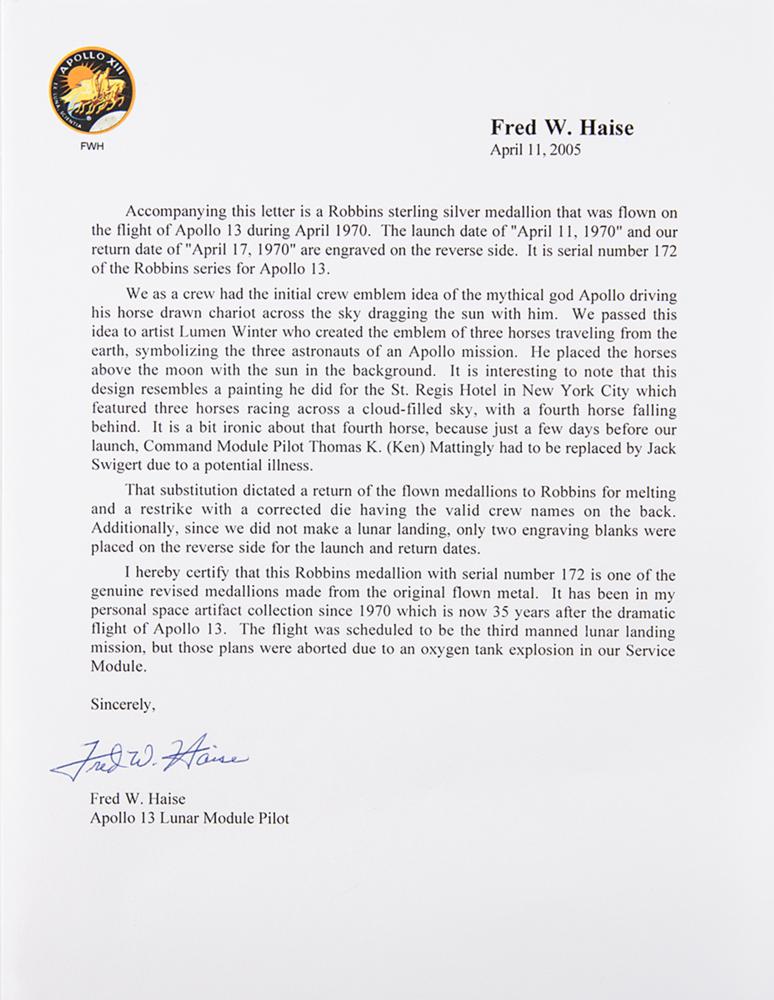 Accompanied by the original plastic case and a signed letter of authenticity from Haise, in part: "Accompanying this letter is a Robbins sterling silver medallion that was flown on the flight of Apollo 13 during April 1970…It is serial number 172 of the Robbins series for Apollo 13…We as a crew had the initial crew emblem idea of the mythical god Apollo driving his horse drawn chariot across the sky dragging the sun with him. We passed this idea to artist Lumen Winter who created the emblem of three horses traveling from the earth, symbolizing the three astronauts of an Apollo mission. He placed the horses above the moon with the sun in the background. It is interesting to note that this design resembles a painting he did for the St. Regis Hotel in New York City which featured three horses racing across a cloud-filled sky, with a fourth horse falling behind. It is a bit ironic about that fourth horse, because just a few days before our launch, Command Module Pilot Thomas K. (Ken) Mattingly had to be replaced by Jack Swigert due to a potential illness.