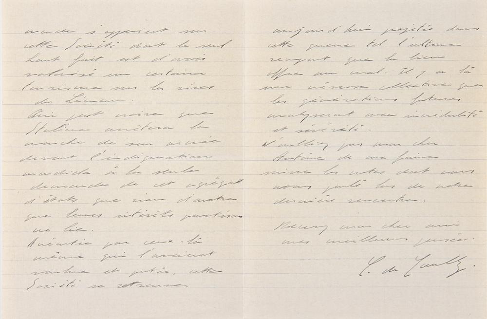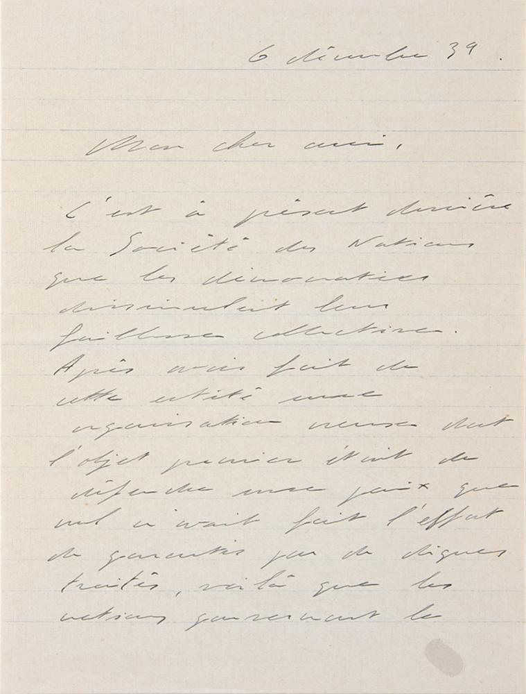 World War II-dated ALS in French, signed “C. de Gaulle,” three pages on two adjoining sheets, 5.25 x 7, December 6, 1939. Handwritten letter to a friend, remarking on the progress of Joseph Stalin and the ineptitude of the League of Nations, in full (translated): “It is now behind the League of Nations that the democracies hide their collective weaknesses. After having made this entity a hollow organization whose primary object was to defend a peace that no one had made the effort to guarantee by worthy treaties, now the nations governing the world rely on this Society whose only achievement is to have promoted a certain tourism on the shores of Lake Geneva. Who can believe that Stalin will stop the march of his army in the face of world indignation at the sole request of this aggregate of states that nothing but their partisan interests binds. Destroyed by the very people who wanted and carried it, this Society now finds itself thrown into this war like the last rampart that good offers against evil. There is a collective neurosis here that future generations will analyze with incredulity and severity. Don't forget, my dear Antoine, to send me the notes we talked about during our last meeting. Receive my dear friend my best thoughts.” In fine condition, with a couple of small stains.