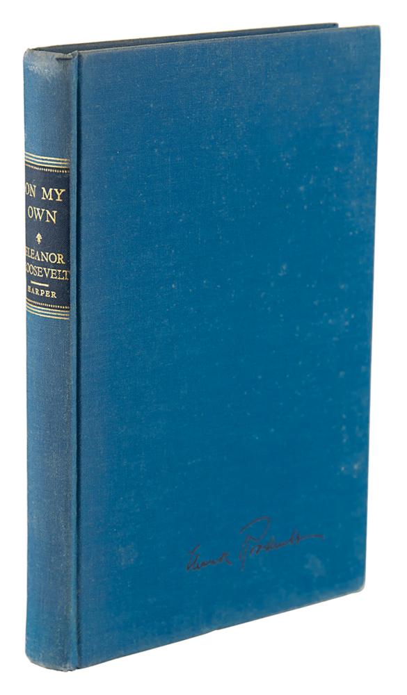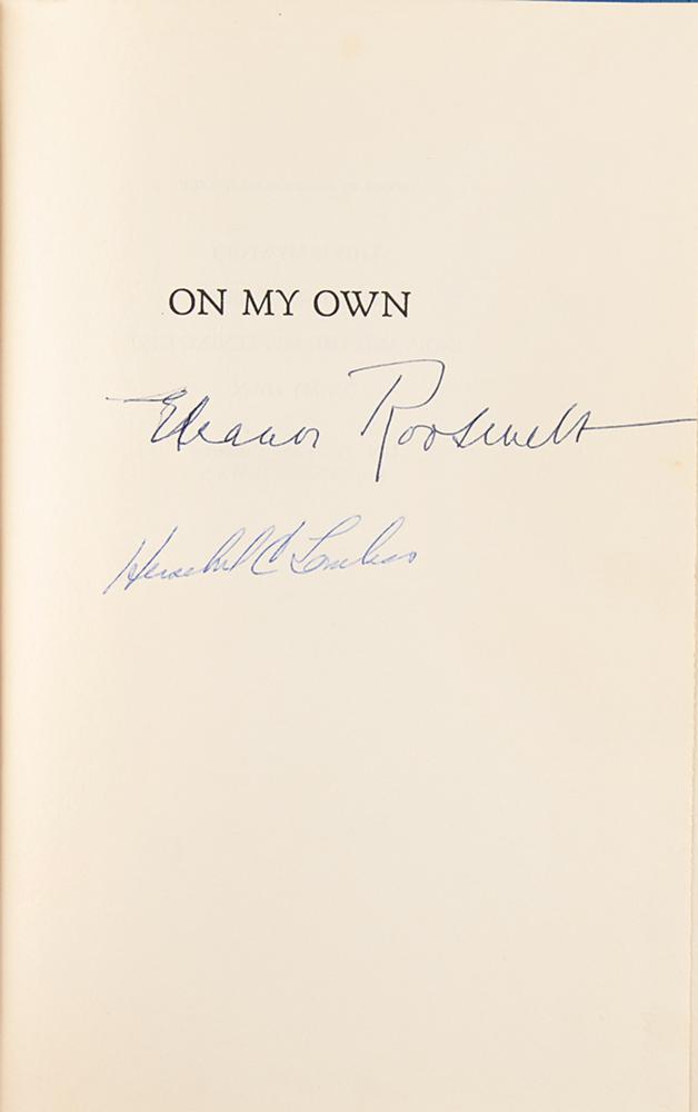 Signed book: On My Own. First edition. NY: Harper & Brothers, 1958. Hardcover, 6.5 x 9.5, 241 pages. Signed on the half-title page in ballpoint by Eleanor Roosevelt. Also signed by Herschel C. Loveless, who served as governor of Iowa from 1957 to 1961. In fine condition, with light cover wear, pen trouble forcing her to retrace the first two letters of the signature, and an ownership inscription to the front pastedown.