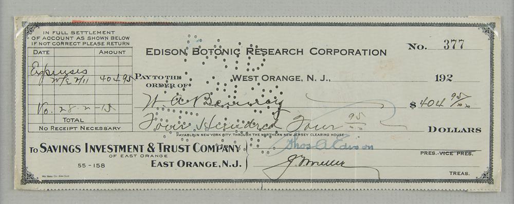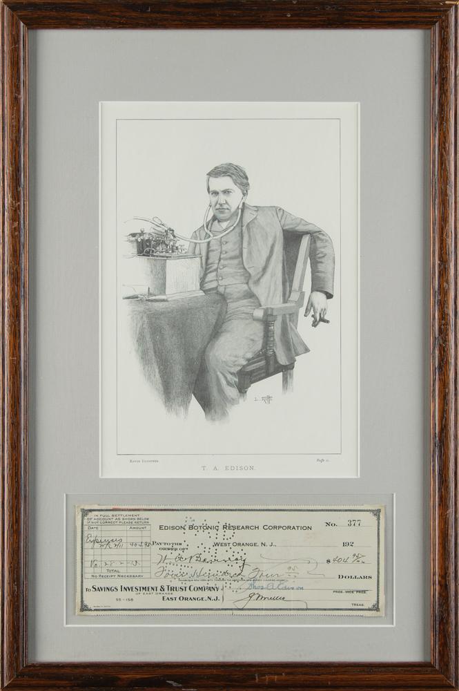 Edison Botonic Research Corporation business check, 8.5 x 3, filled out in another hand and signed by Edison, "Thos. A. Edison," payable to research superintendent W. A. Benney for $404.95, date faded but circa 1920s. Attractively corner-mounted, matted, and framed with a portrait to an overall size of 12.75 x 19. In fine condition, with two vertical folds passing through the signature.
