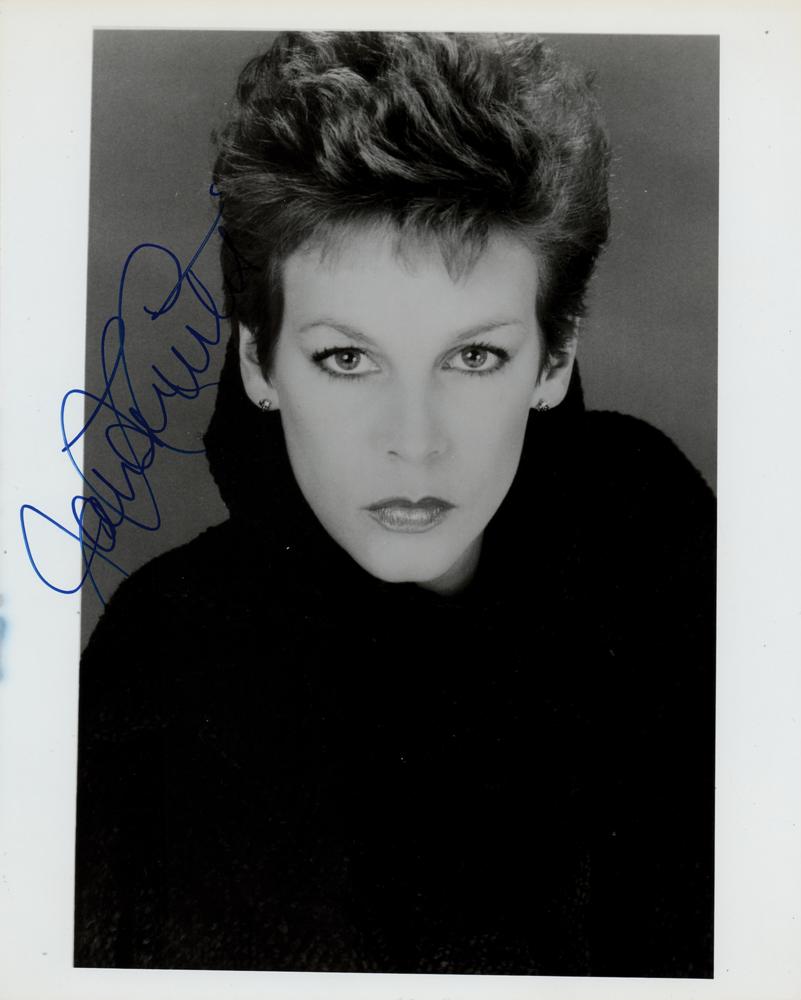 Glossy 8 x 10 close-up photo of Oscar-winning actress Jamie Lee Curtis, signed in blue felt tip. In fine condition, with a stain to the left edge.