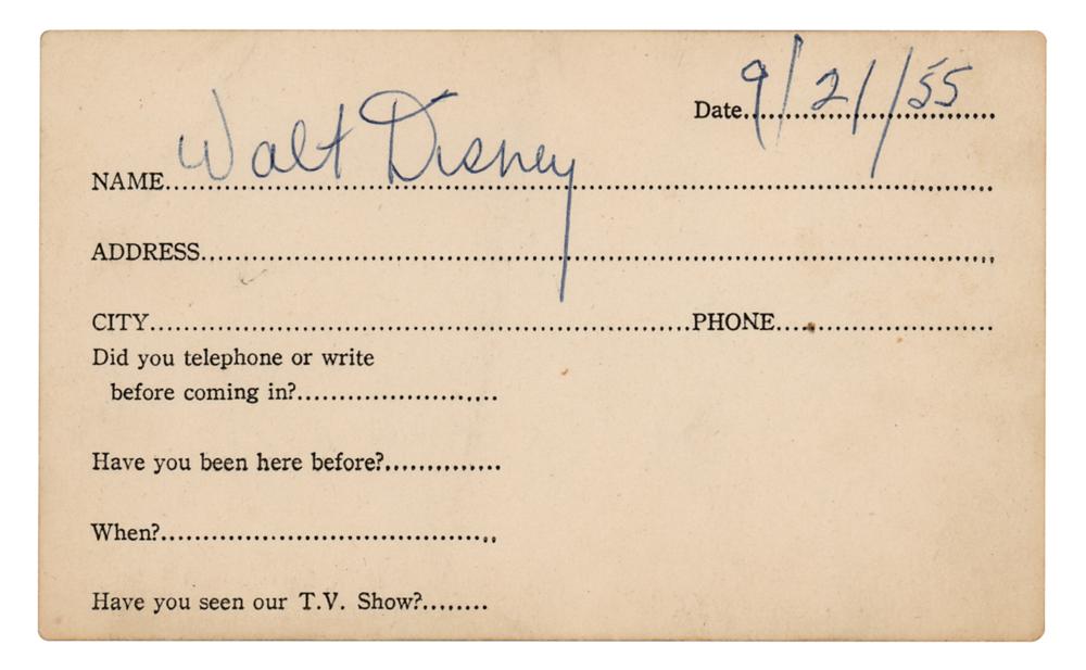 Ideal vintage ballpoint signature, "Walt Disney,” on an off-white 5 x 3 card, identified and dated ("9/21/55") on the reverse in another hand. In very fine condition.