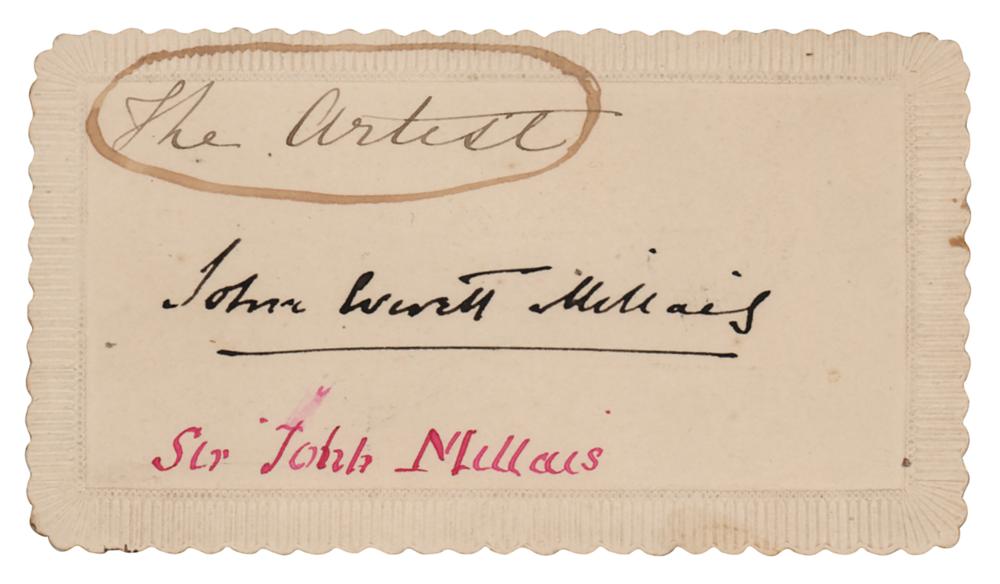Noted English painter and illustrator (1829-1896) who was one of the founders of the Pre-Raphaelite Brotherhood. Bold ink signature, "John Everett Millais,” on an off-white 3.25 x 2 card. In fine condition, with a circled name notation at the top, easily matted out.