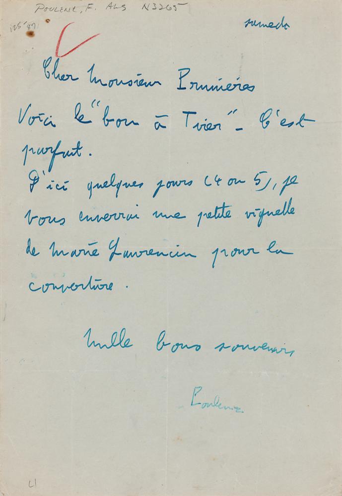 Renowned French composer (1899-1963) best known for his colorful, energetic keyboard works, art songs, and choral music. ALS in French, signed “Poulenc,” one page, 7 x 10, no date. Untranslated handwritten letter referring to a work by the Cubist painter Marie Laurencin. In fine condition.