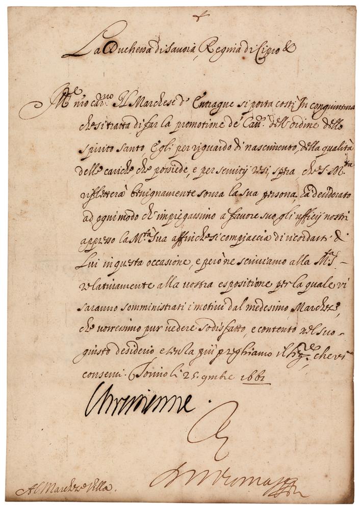 Sister of Louis XIII and Duchess of Savoy by her marriage to Victor Amadeus I (1606-1663). LS in Italian, signed “Christine,” one page, 8.25 x 12, November 25, 1661. Untranslated letter, boldly signed at the conclusion by Christine of France. In fine condition.