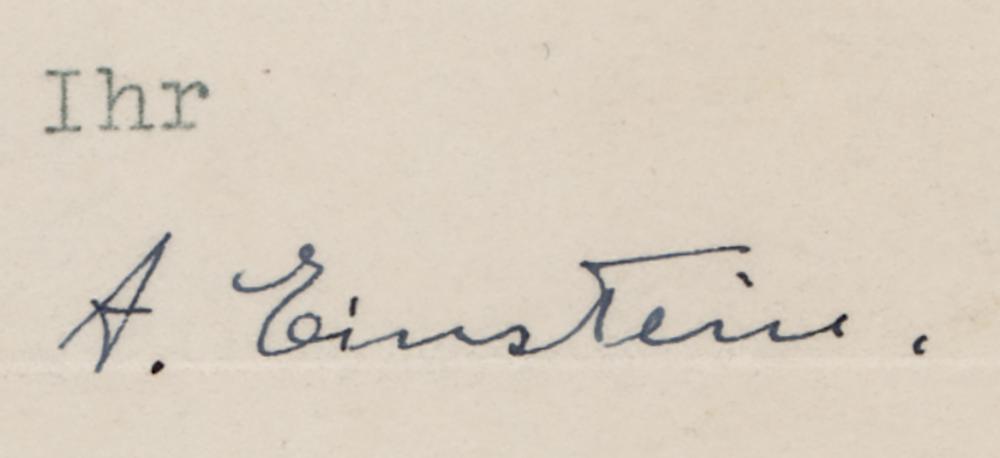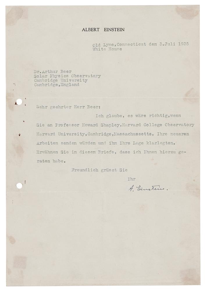 TLS in German, signed “A. Einstein,” one page, 7.25 x 10.5, personal letterhead, July 3, 1935. Letter to Cambridge astronomer Arthur Beer, in full (translated): "I think it would be right if you sent your more recent work to Professor Howard Shapley, Harvard College Observatory, Harvard University, Cambridge, Massachusetts, and made your position clear to him. Mention in this letter that I advised you to do this." In very good to fine condition, with trimmed edges and small stains along the perimeter from old mounting remnants on the reverse. Interesting scientific content from Einstein pertaining to an astronomical matter.