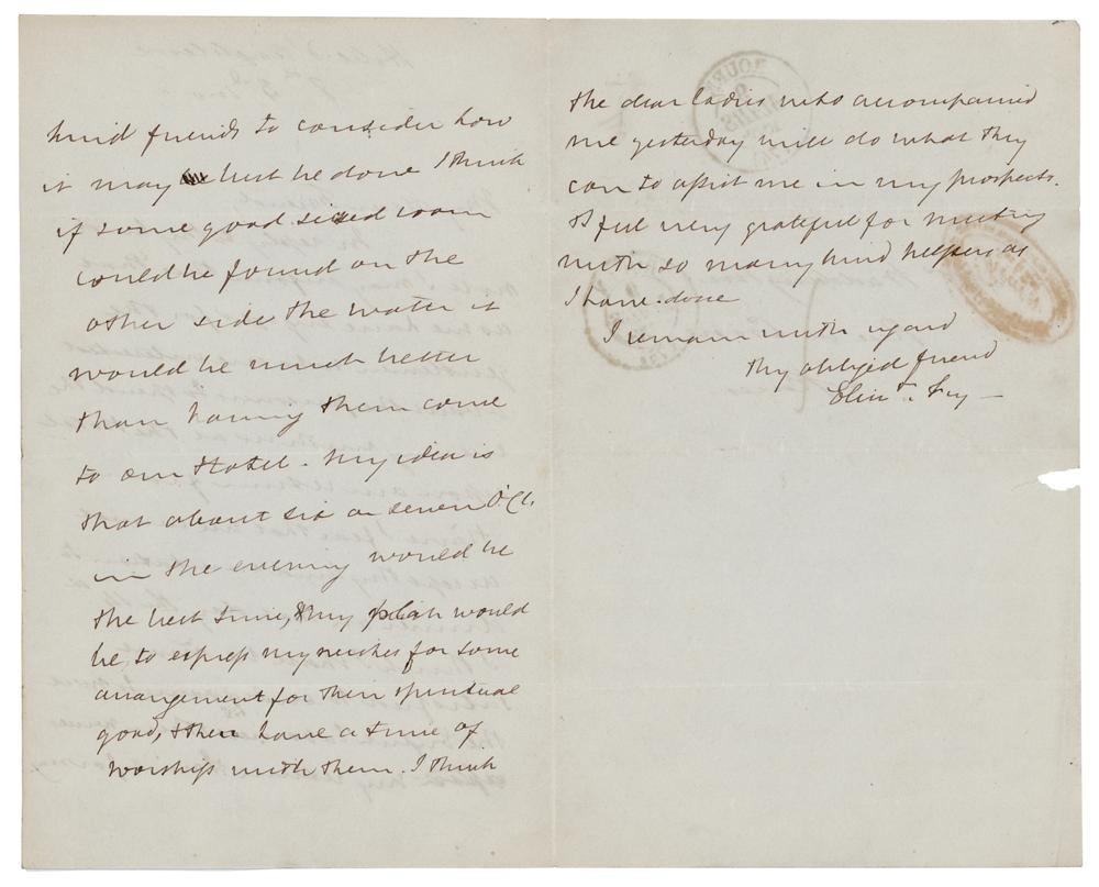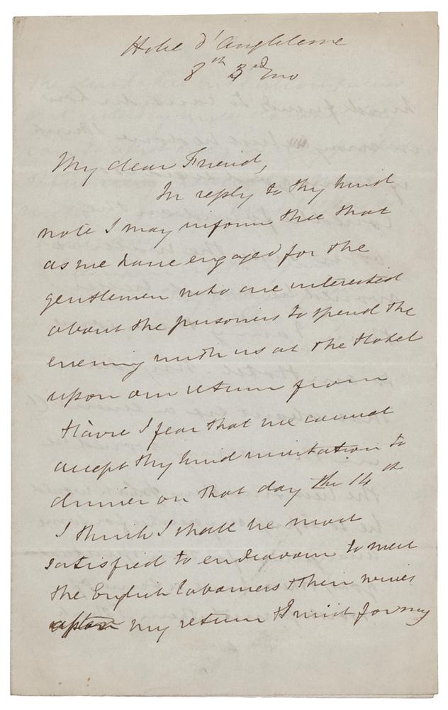 Quaker humanitarian and reformer of English prisons (1780-1845). ALS signed “Eliz. Fry,” three pages on two adjoining sheets, 5.25 x 8.25, March 8, [no year]. Handwritten letter to a friend, in part: "I may inform thee that as we have engaged for the gentlemen who are interested about the prisoners to spend the evening with us at the Hotel upon our return from Havre I fear that we cannot accept thy kind invitation to dinner on that day the 14th. I think I shall be most satisfied to endeavour to meet the English labourers & their wives upon my return." In fine condition.