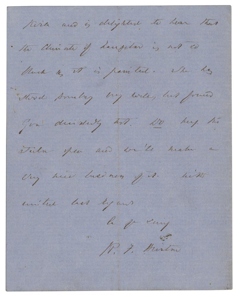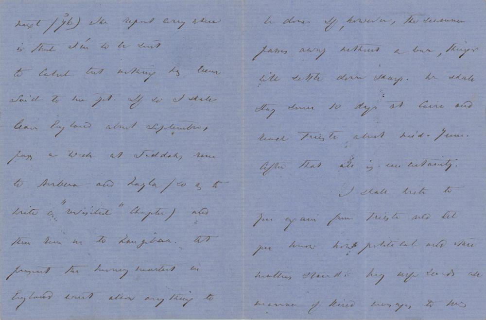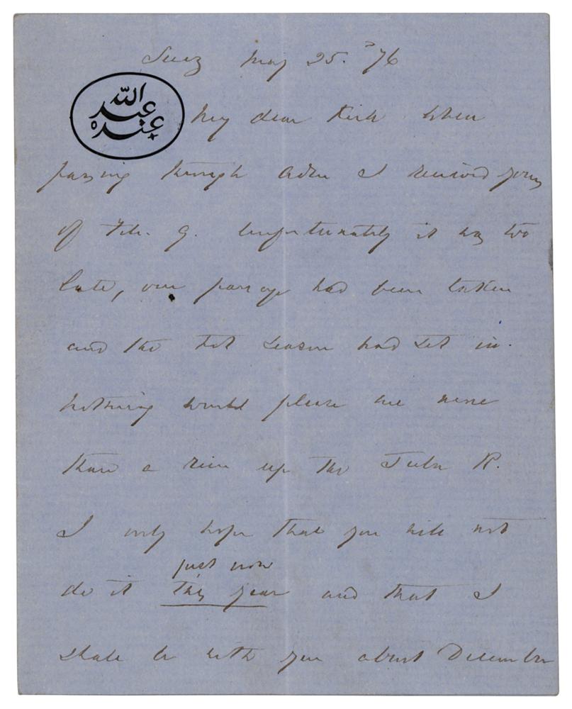English explorer, translator, writer, soldier, and diplomat (1821-1890) renowned for his travels and explorations within Asia and Africa, as well as his extraordinary knowledge of languages and cultures. ALS signed “R. F. Burton,” four pages on two adjoining sheets, 4 x 5, personal Arabic letterhead, May 25, 1876. Handwritten letter to "Kirk," in part: "When passing through Aden, I received yours of Feb. 9. Unfortunately, it is way too late, our passage had been taken and the hot season had set in. Nothing would please me more than a run up the Tulu R. I only hope that you will not do it just now/this year and that I shall be with you about December next (76). The report every where is that I'm to be sent to Cabul but nothing has been said to me yet. If so I shall leave England about September, pass a week at Jeddah, run to?Layla (so as to write a 'revisited' chapter) and then run on to Zanzibar. At present the money masters in England won't allow anything to be done?We shall stay some 10 days at Cairo and leave Trieste about mid-June. After that all is uncertainty. I shall write to you again from Trieste and let you know how political?matters stand. My wife sends all manner of kind messages to Mrs. Kirk and is delighted to hear that the climate of Zanzibar is not so black as it is painted." In fine condition.