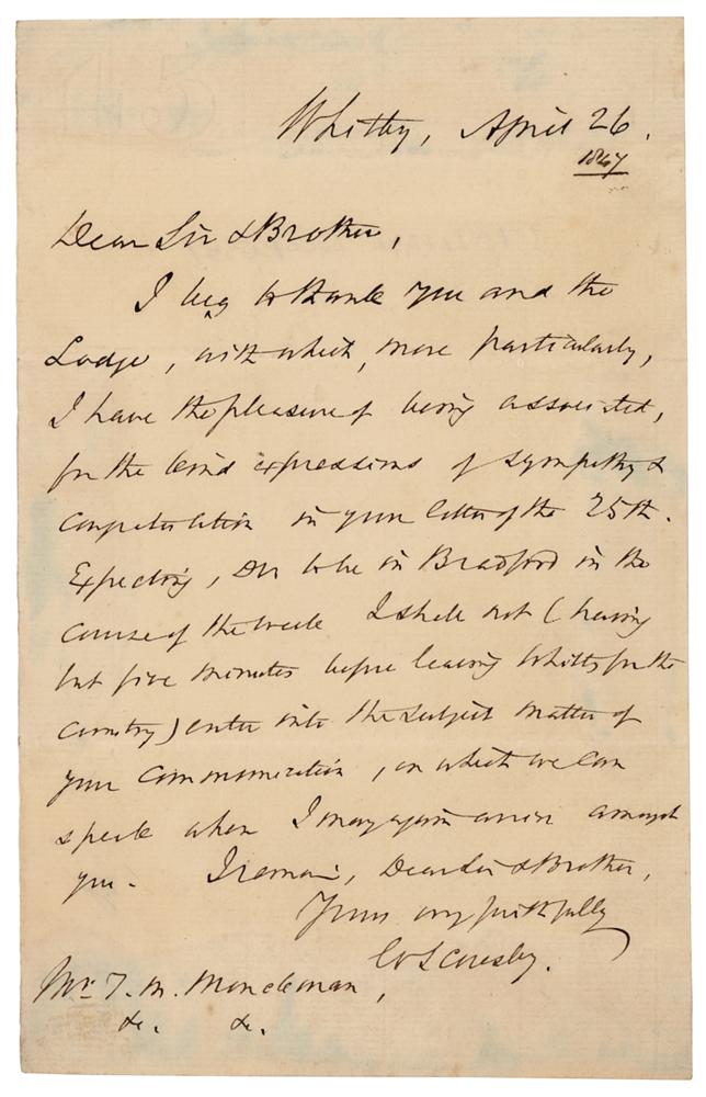 British arctic explorer and scientist (1789-1857) who produced a pioneering survey of the eastern coast of Greenland and produced a number of important papers on the nature of terrestrial magnetism. ALS signed “W. Scoresby,” one page, 4.5 x 7.25, April 26, 1847. Handwritten letter to a gentleman, in part: "I beg to thank you and the Lodge, with which, more particularly, I have the pleasure of being associated, for the kind expressions of sympathy & congratulation in your letter of the 25th. Expecting, on to be in Bradford in the course of the week, I shall not (having not five minutes before leaving Whitby for the country) enter into the subject matter of your communication." In fine condition, with some light show-through from old mounting residue on the back.