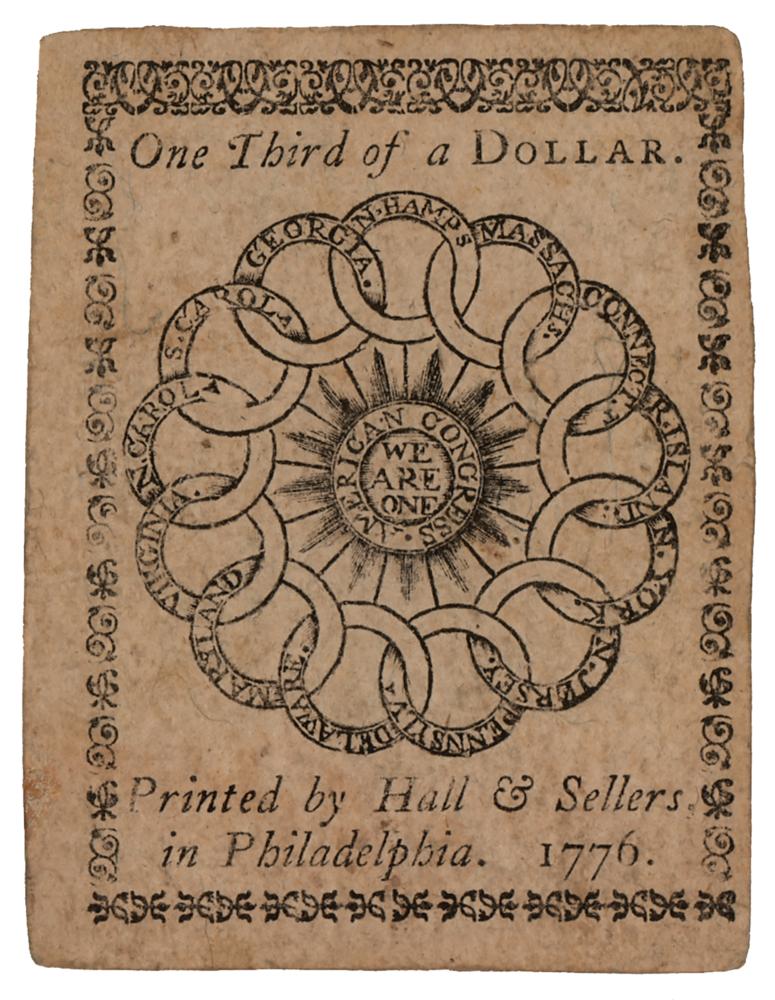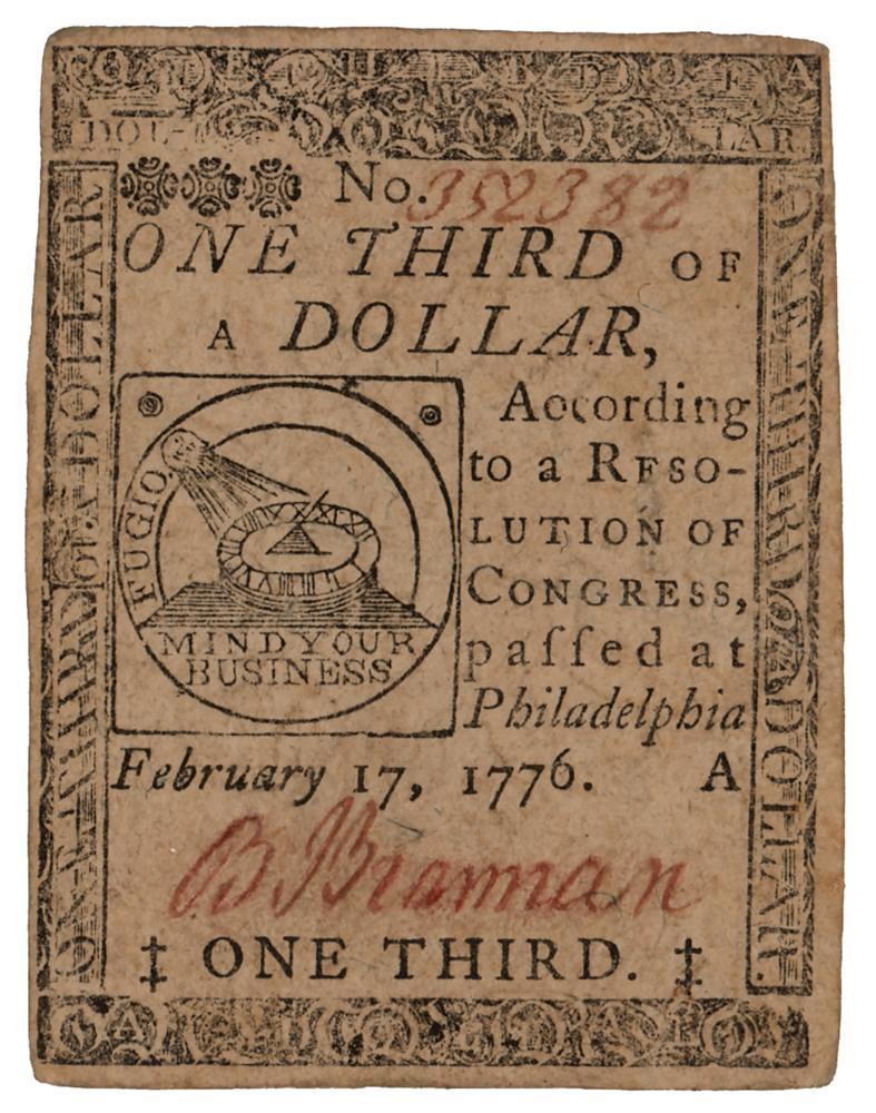 Revolutionary War-dated continental currency for $1/3 issued in accordance with a resolution of Congress passed at Philadelphia on February 17, 1776, serial no. 352382, printed by Hall & Sellers. On the face is a "Mind Your Business" emblem at right, often attributed to Benjamin Franklin; the reverse portrays an interlocked chain with the names of the 13 colonies, encircling the rayed central motto "We Are One / American Congress." In fine condition. A desirable 1776-dated fractional note with patriotic symbolism.