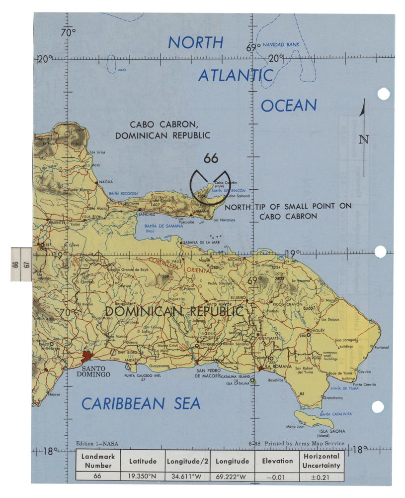 Double-sided landmark map page from the Apollo 9 'Landmark Maps & Photos' checklist (SKB32100026-301, S/N 1005), carried on the mission from March 3-13, 1969, originating from the personal collection of Apollo 9 Commander Jim McDivitt, as attested by Richard Garner of The Space Collective. The 8 x 10.5 page features maps of the northwest coast of Haiti and of the Dominican Republic; Apollo 9 CMP Dave Scott has made several pencil annotations for latitude and longitude around Cap du Môle, Haiti. Charts give latitude, longitude, elevation, and horizontal uncertainty calculations for the locations indicated. A tab on the edge reads: "66/67." In fine condition. Accompanied by a certificate of authenticity from The Space Collective, a color copy of McDivitt's letter of provenance for the complete checklist, and an image of McDivitt holding the book.