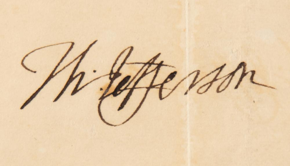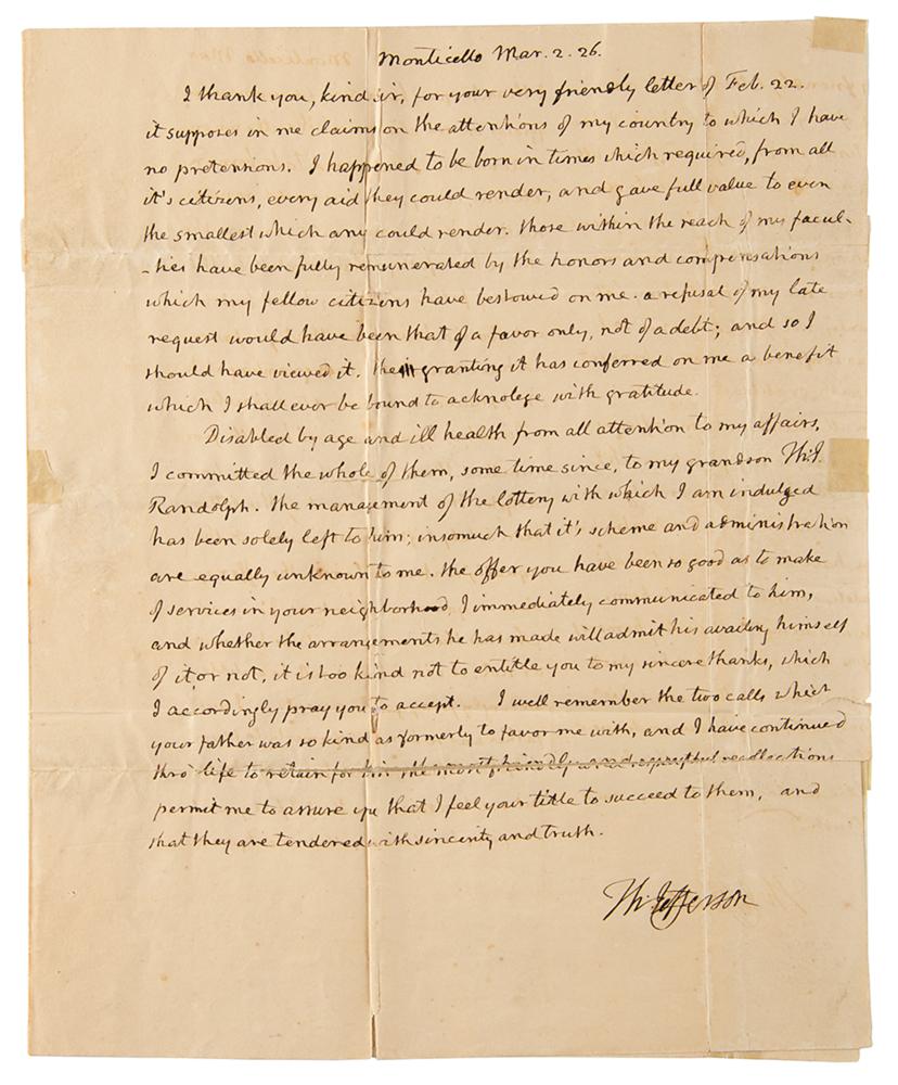 ALS signed “Th: Jefferson,” one page, 7.75 x 9.5, March 2, 1826. Handwritten letter from Monticello to Thomas Shore, responding to an offer of assistance related to the crushing debt that Jefferson struggled under toward the end of his life. In 1817, the great statesman had turned the financial management of his estate over to his eldest grandson, Thomas Jefferson Randolph, who ultimately devised a lottery scheme as a fundraiser: the idea was to sell low-cost lottery tickets with land from Jefferson's vast Monticello acreage as the prize. In February 1826, he successfully applied to Virginia's General Assembly to hold a public lottery—however, the motion required that Jefferson sell the entire plantation, rather than bits and pieces, which meant that the entirety of Monticello would pass out of his family. Thomas Jefferson's death on July 4, 1826, ended the lottery scheme, and left his estate encumbered with over $100,000 in debts and far fewer assets. His daughter, Martha Jefferson Randolph, retained Monticello until 1831, when she sold the property for $7,500.