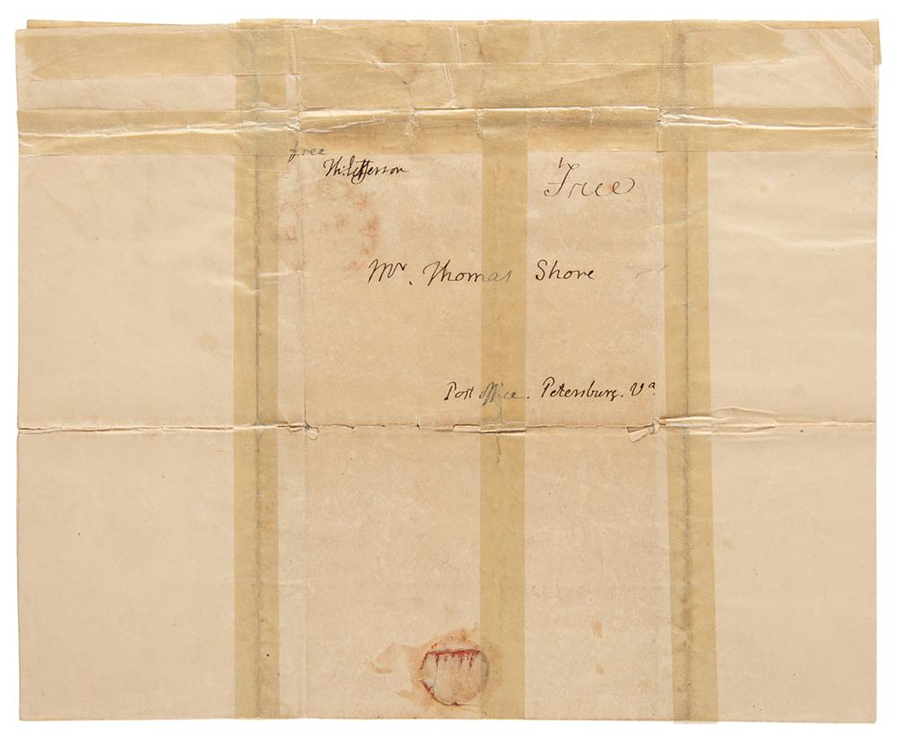 Addressed on the integral leaf in Jefferson's hand to "Mr. Thomas Shore, Post Office, Petersburg, Va.," and franked in the upper left, "free, Th: Jefferson." In very good condition, with fold separations and seal-related paper loss inexpertly repaired with old tape.