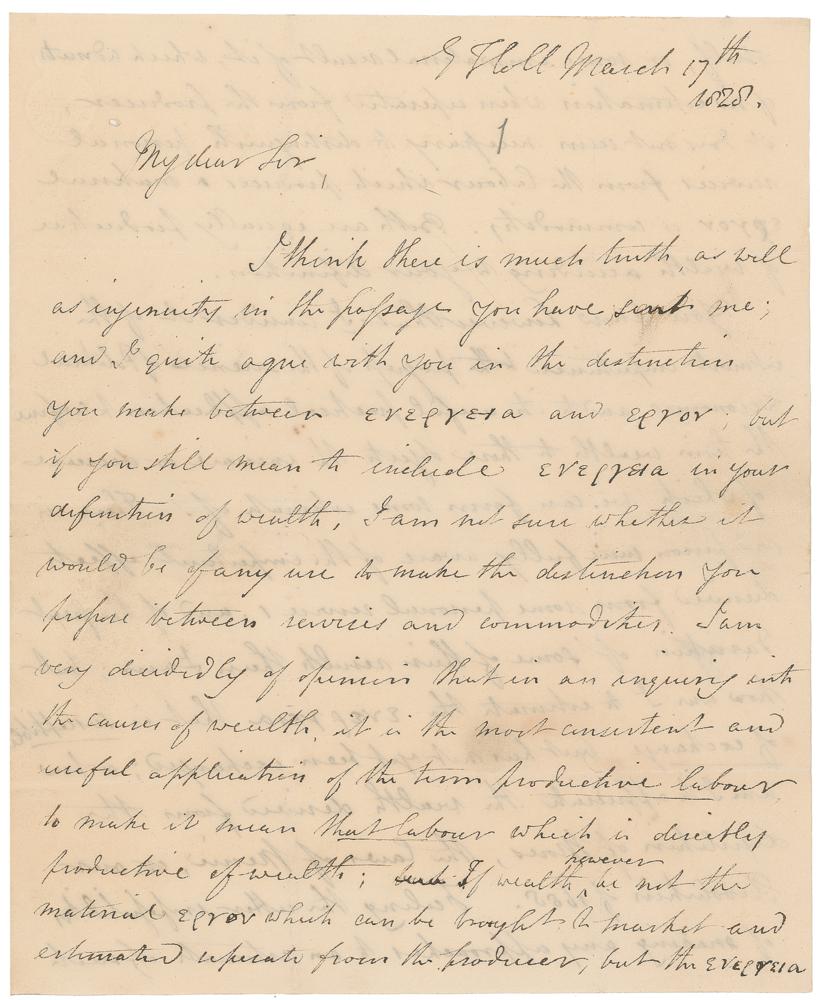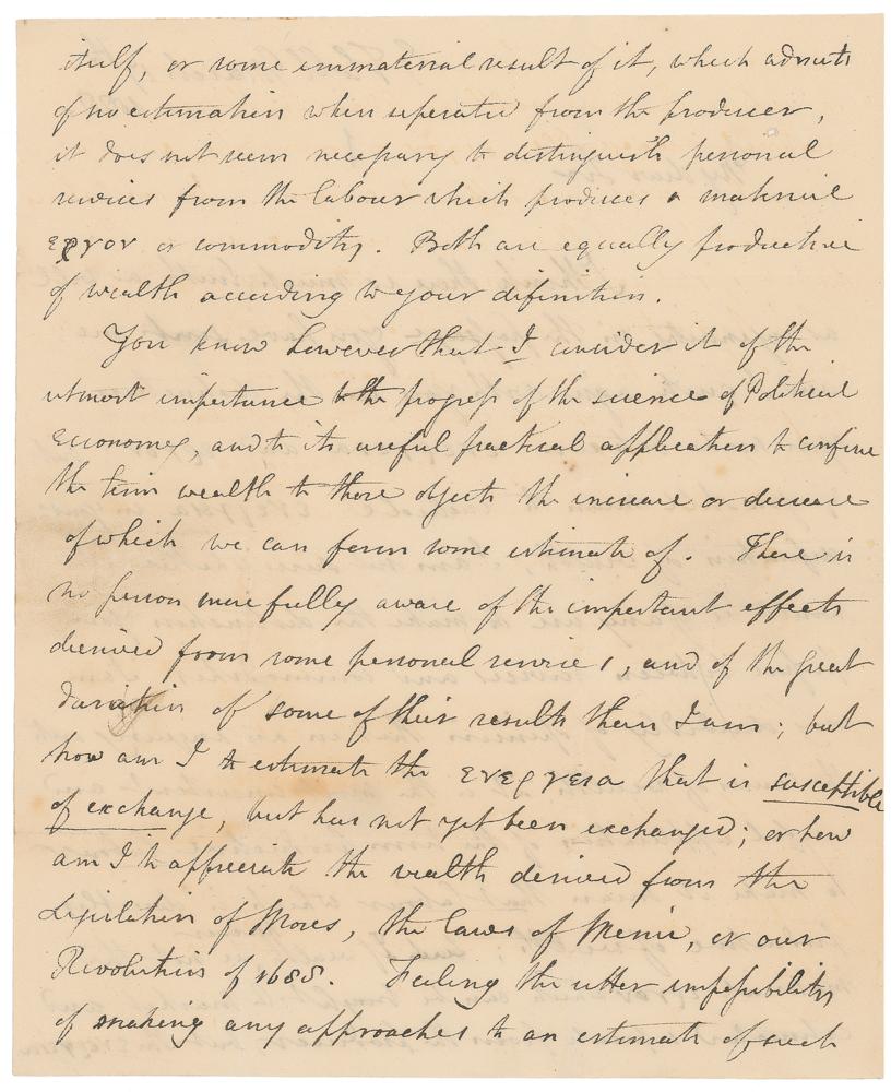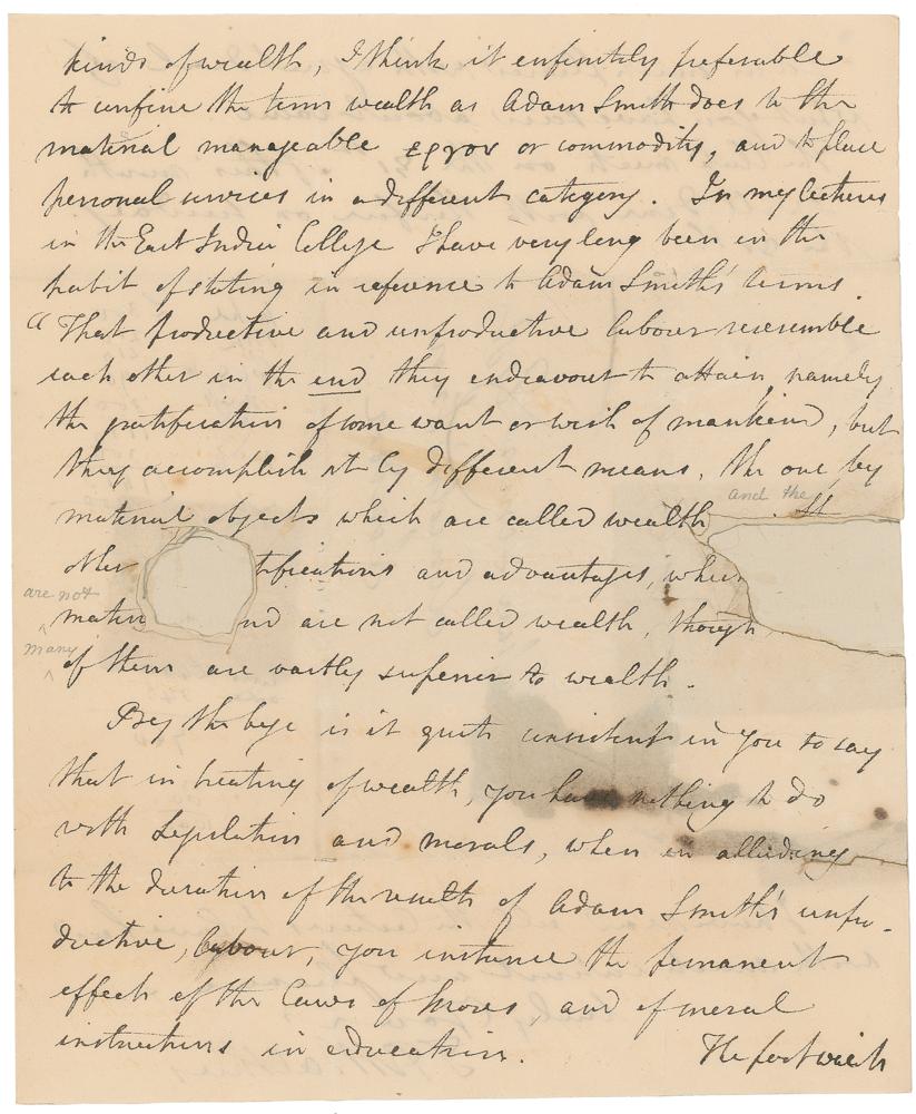 You know however that I consider it of the utmost importance that the progress of the science of Political Economy and to its useful practical applications to confine the term wealth to those objects the increase or decrease of which we can form some estimate of. There is no person more fully aware of the important effects derived from some personal service, and of the great duration of some of their results than I am; but how am I to estimate the ενερνεια that is susceptible of exchange, but has not yet been exchanged; or how am I to appreciate the wealth derived from the Legislation of Moses, the laws of Menic, or our Revolution of 1685. Feeling the utter impossibilities of making any approaches to an estimate of such kinds of wealth, I think it infinitely preferable to confine the term wealth as Adam Smith does to the material manageable ερνον or commodity, and to place personal services in a different category. In my lectures in the East India College I have very long been in the habit of stating in reference to Adam Smith's terms 'That productive and unproductive labour resemble each other in the end they endeavor to attain namely the gratification of some want or wish of mankind, but they accomplish it by different means.'" The last page is addressed to Nassau Senior in London, and bears two columns of numbers. In very good condition, with two repaired areas of paper loss to the second page affecting several words of text, intersecting folds, and some scattered light soiling. Accompanied by a custom-made presentation folder.