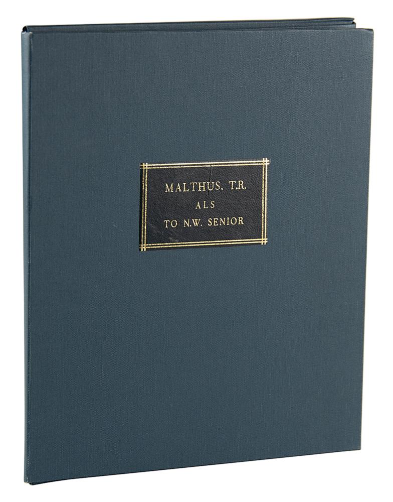 English scholar influential in the fields of political economy and demography (1766-1834). ALS signed "T. R. Malthus," four pages on two adjoining sheets, 7.25 x 9, March 17, 1828. Letter written from East India College to Nassau William Senior, reads, in part: "I think there is much truth as well as ingenuity in the passage you have sent me; and I quite agree with you in the distinction you make between ενερνεια and ερνον; but if you still mean to include ενερνεια in your definition of wealth, I am not sure whether it would be of any use to make the distinction you propose between services and commodities. I am very decidedly of opinion that in an inquiry into the causes of wealth, it is the most consistent and useful application of the term productive labour to make it mean that labour which is directly productive of wealth; If wealth however be not the material ερνον which can be brought to market and estimated separate from the producer, but the ενερνεια itself, or some immaterial result of it, which adjusts of no estimation when separated from the producer it does not seem necessary to distinguish personal services from the labour which produces a material ερνον or commodity. Both are equally productive of wealth according to your definition.