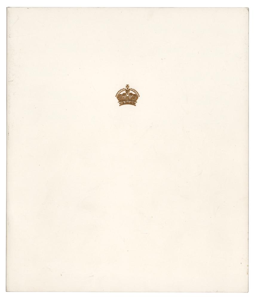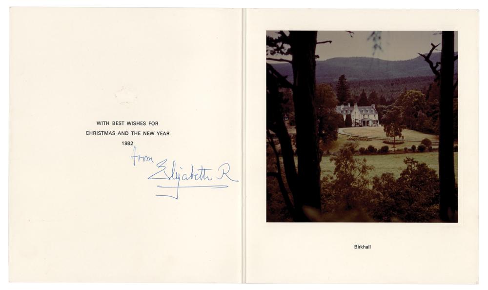 Royal Christmas card from 1982 with an embossed crown on the front, measuring 15 x 8.75 open, the inside featuring an affixed color photo of the Birkhall estate in Aberdeenshire, Scotland, signed inside in blue ballpoint, “from, Elizabeth R.” In very fine condition.