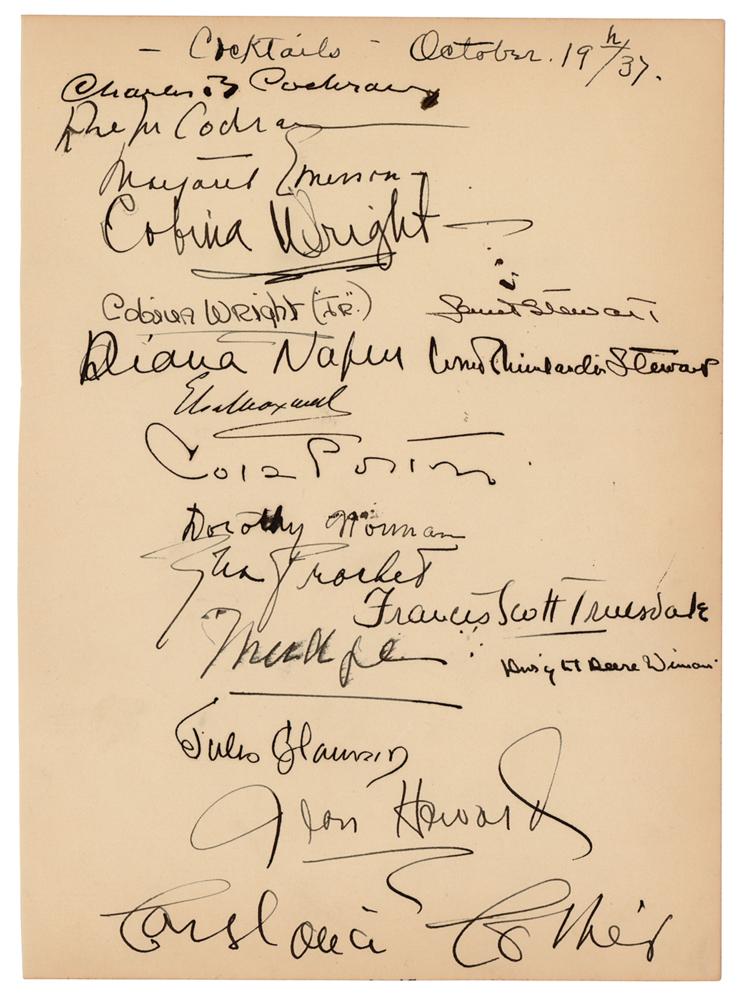 Vintage fountain pen signature, "Cole Porter,” on an off-white 6.5 x 9 sheet, headed: "Cocktails—October 19/37." Porter signs amidst several lesser celebrities of the era, including Cobina Wright, Cobina Wright Jr., Diana Napier, and Constance Collier. In fine condition.