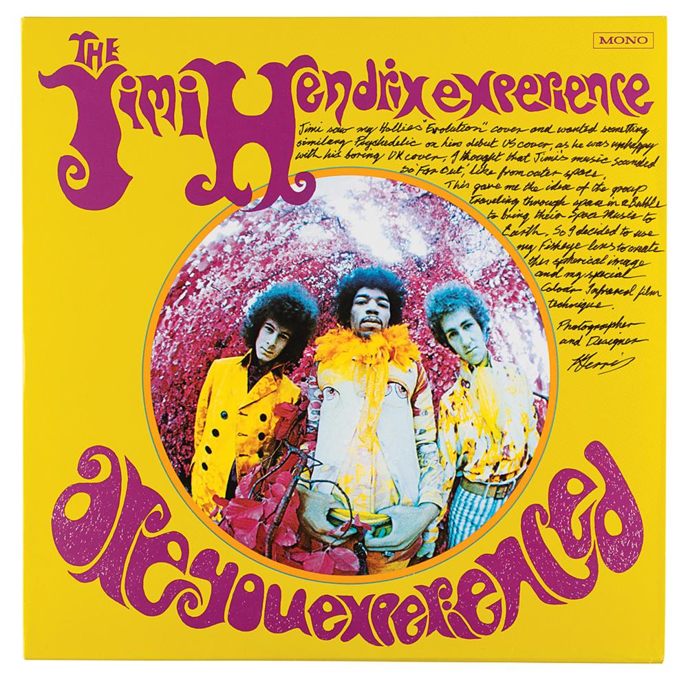 2013 album pressing of Are You Experienced, the debut album from the Jimi Hendrix Experience, signed on the front cover in black felt tip by its designer, "Photographer and Designer, Karl Ferris," who adds a lengthy inscription above: “Jimi saw my Hollies ‘Evolution’ cover and wanted something similarly psychedelic on his debut US cover, as he was unhappy with his boring UK cover. I thought that Jimi’s music sounded so ‘Far Out,’ like from outer space. This gave me the idea of the group traveling through space in a Bubble to bring their Space Music to Earth. So I decided to use my Fisheye lens to create this spherical image and my special Colour Infrared film technique.” In very fine condition. The record is included. Accompanied by a full letter of authenticity from JSA.
