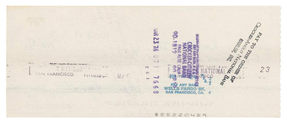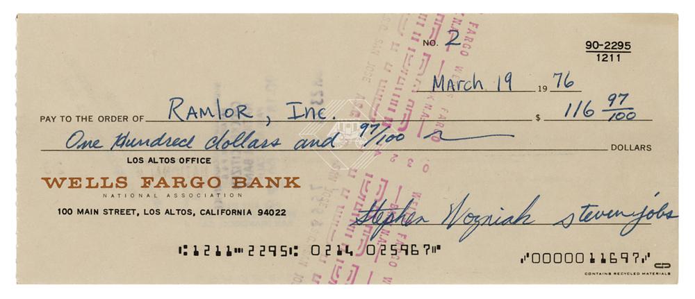 Historic Wells Fargo bank check, 7.5 x 3, filled out and signed by Steve Jobs, "steven jobs," and countersigned by Steve Wozniak, "Steve Wozniak," payable to Ramlor, Inc. for $116.97 (with "One Hundred dollars and 97/100" curiously written as the amount), March 19, 1976. This temporary check, issued upon opening Apple's first bank account, bears the same routing and account numbers as other early Apple Computer Company checks we have offered—those, however, date to July 1976 and are imprinted with Apple's first official address at '770 Welch Rd., Ste. 154, Palo Alto'—the location of an answering service and mail drop that they used while still operating out of the famous Jobs family garage. In very fine condition.