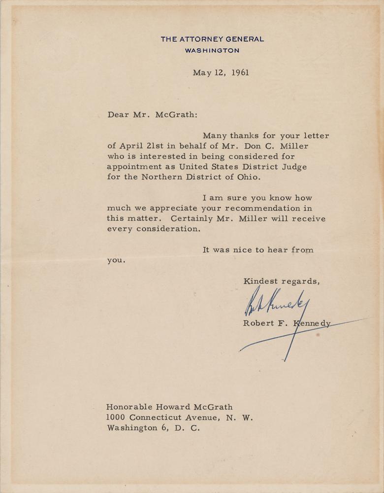 TLS, one page, 7 x 9, The Attorney General letterhead, May 12, 1961. Letter to the Hon. Howard McGrath, in full: "Many thanks for your letter of April 21st on behalf of Mr. Don C. Miller who is interested in being considered for appointment as United States District Judge for the Northern District of Ohio. I am sure you know how much we appreciate your recommendation in this matter. Certainly Mr. Miller will receive every consideration." In fine condition, with light toning from prior display. The judge in question, Don C. Miller, is far more famous for his exploits on the gridiron than in the courtroom—he formed one-quarter of Notre Dame's famous 'Four Horsemen' backfield as part of Knute Rockne's legendary 1924 football squad. Miller went on to practice law, serving as a United States Attorney from 1941-1953, and a United States Bankruptcy Court judge from 1965-1977.