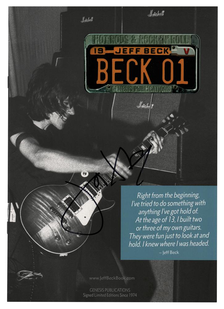 High-quality sales brochure from Genesis Publications for the Jeff Beck autobiography Beck 01: Hot Rods and Rock'n'roll, six pages, 8.25 x 11.75, signed on the front cover in black felt tip. In very fine condition. The consignor notes that the autograph was obtained at the book’s premiere at Mel’s Drive-In on the Sunset Strip in Los Angeles, California, on August 8, 2016. A printed picture of Beck taken at the time of the signing is included.