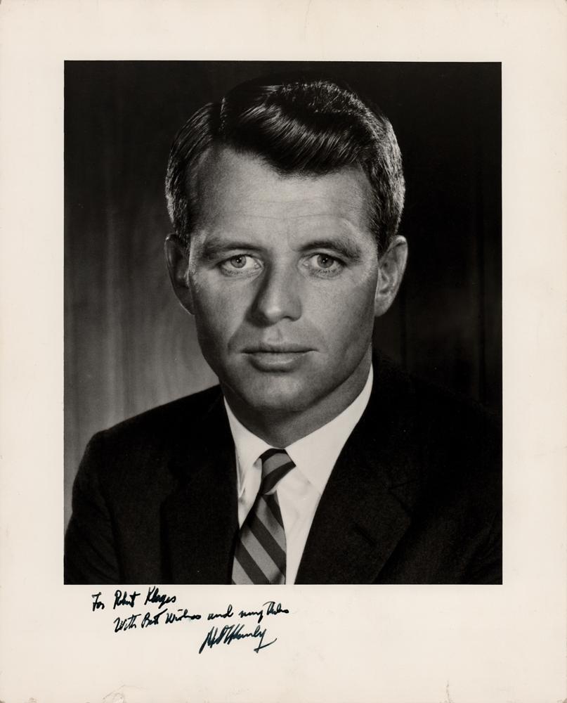 Matte-finish 8 x 10 photo of Kennedy in a suit and tie, signed and inscribed in fountain pen, "For Robert?with best wishes and many thanks, Robert Kennedy." In very good to fine condition, with a light crease to RFK's hair, and two tiny tears to the bottom edge. A fine photographic example of the former Attorney General.