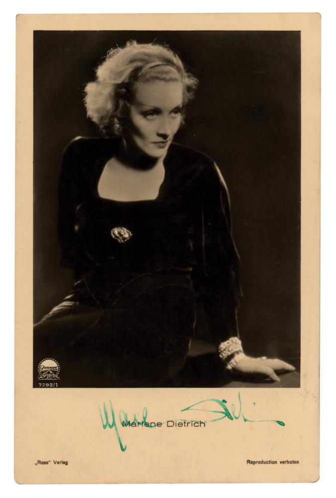 Vintage semi-glossy 3.5 x 5.5 postcard photo of Marlene Dietrich in a head and shoulders pose, signed in fountain pen. The reverse of the photo features writing in an unknown hand. In fine condition, with a light vertical crease in the right border.