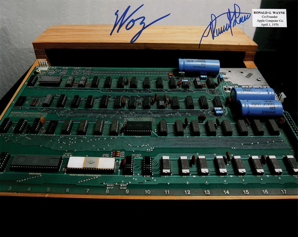 Color satin-finish 10 x 8 photo of an Apple-1 Computer, signed in blue felt tip by Apple co-founders Steve Wozniak ("Woz") and Ron Wayne ("Ronald G. Wayne"). In fine condition, with Wayne's small biographical label affixed beside his signature.