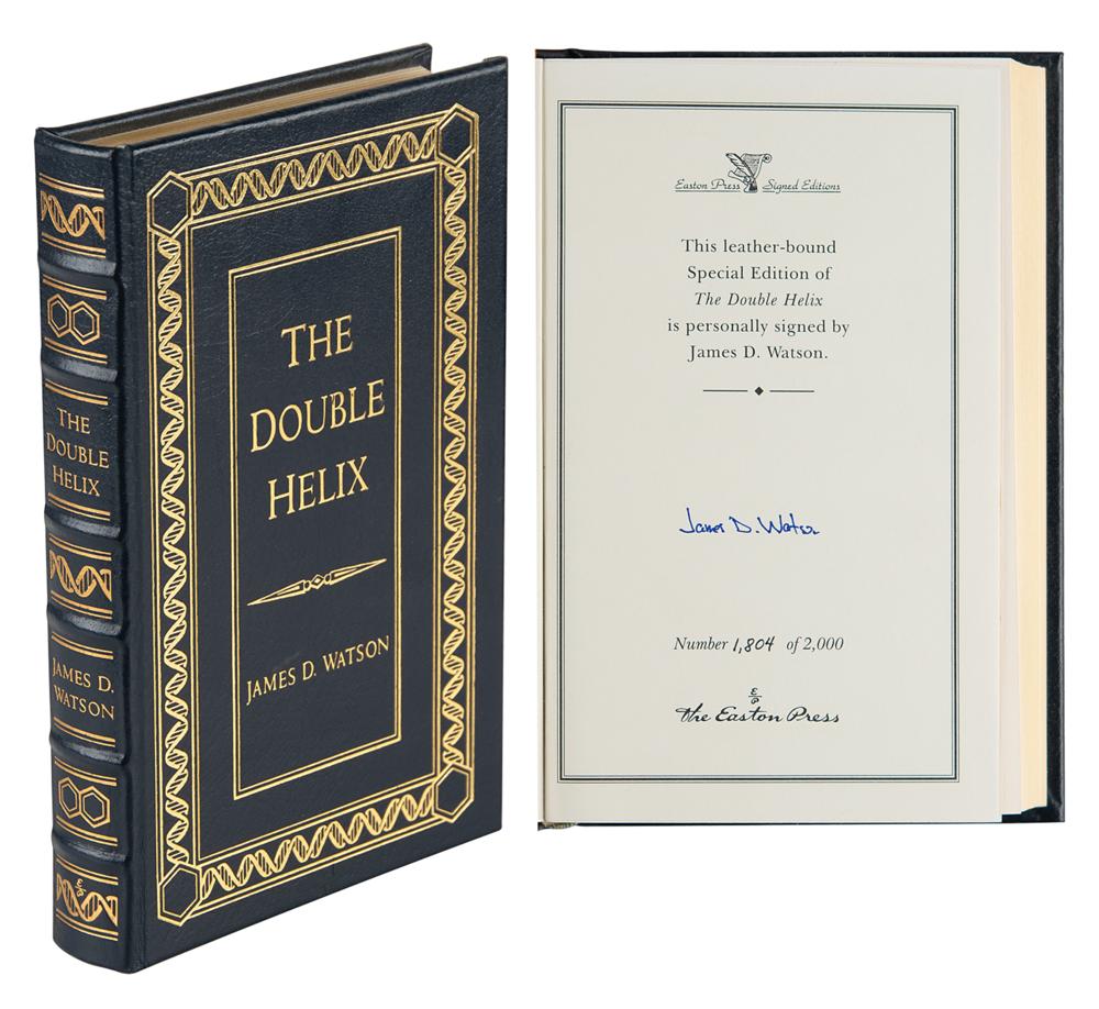 Signed book: The Double Helix. Limited edition, numbered 1804/2000. Norwalk, CT: Easton Press, 1998. Leatherbound hardcover, 5.75 x 8.75, 226 pages. Signed on the colophon in blue felt tip by James D. Watson. In very fine condition.
