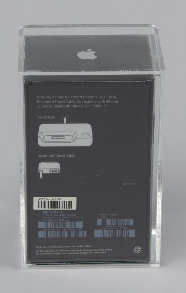 Unopened first generation original Apple iPhone Bluetooth Headset, Order MB162LL/A. The box front shows a life-size image of the headset, the sides and ends feature the silver Apple logo and text, “iPhone Bluetooth Headset,” and the back contains device specifications. In brand new, factory-sealed condition. Encapsulated and graded by CAS with a master grade of “85” and a real grade of “86.9.”