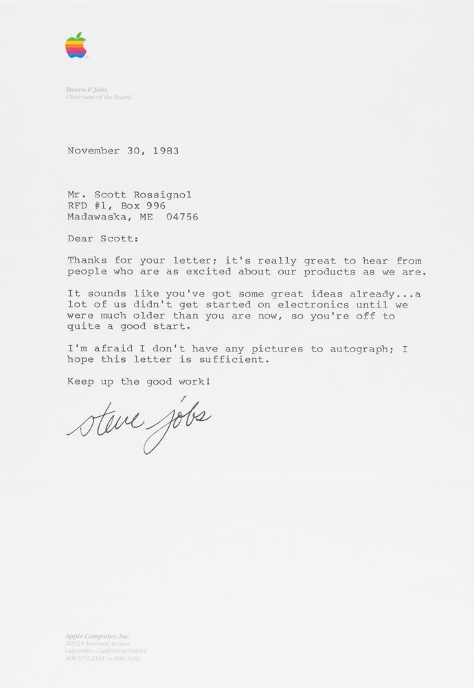 TLS signed "steve jobs," one page, 7.25 x 10.5, Apple Computer letterhead, November 30, 1983. Letter to Scott Rossignol, a young student who wrote to Jobs as part of a school project. In full: "Thanks for your letter; it's really great to hear from people who are as excited about our products as we are. It sounds like you've got some great ideas already? a lot of us didn't get started on electronics until we were much older than you are now, so you're off to quite a good start. I'm afraid I don't have any pictures to autograph; I hope this letter is sufficient." In very fine condition. Accompanied by the original mailing envelope.