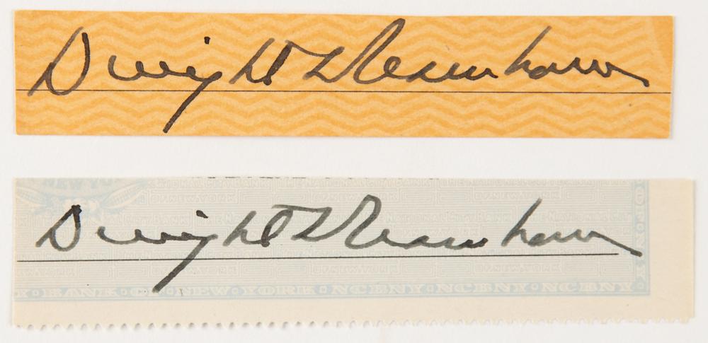 Nice pairing of two neat fountain pen signatures, "Dwight D. Eisenhower," on individual 3.25 x .5 slips clipped from checks. In fine condition.