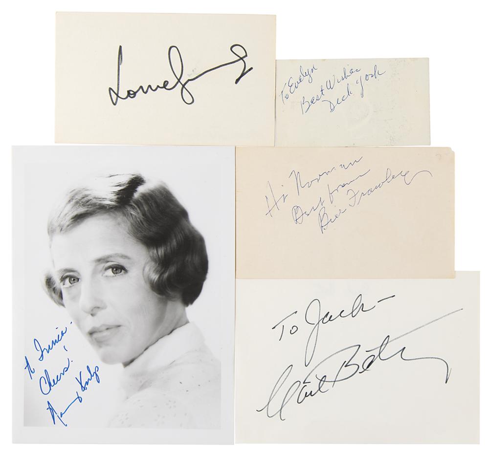 Group lot of eight items signed in ink or felt tip by a notable actor or actress from the Golden Age of classic television, consisting entirely of cut signatures and photographs ranging in size from 3.5 x 2 to 8 x 10.25, with four inscribed. Signers include: Frances Bavier, Carl Betz, Aneta Corsaut, William Frawley, Lorne Greene, Larry Hagman, Nancy Kulp, and Dick York. In overall fine condition.