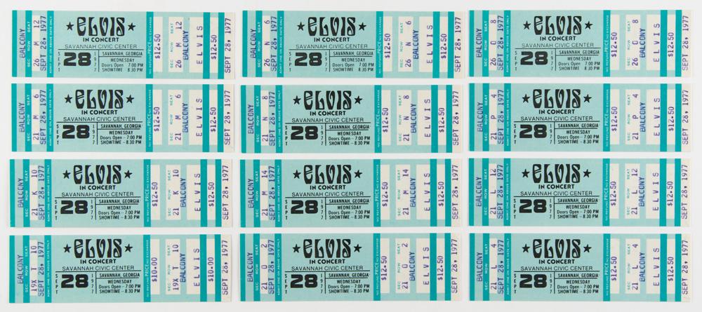 Collection of 12 unused blue “Elvis in Concert” tickets, each 5.25 x 1.5, each for an Elvis Presley show at the Savannah Civic Center in Savannah, Georgia, on September 28, 1977, with a showtime of 8:30 p.m. The tickets read “ELVIS: In Concert,” and were issued for Balcony Sections 19x, 21, and 26. In overall fine condition. The concert ultimately never took place as Presley passed away on August 16, 1977, at the age of 42.
