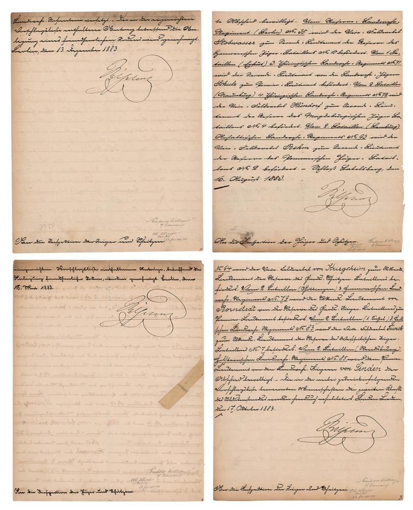 Four manuscript DSs in German, signed “Wilhelm,” each one page both sides , 9 x 11.25, all dated 1883. Four untranslated official documents, each signed at the conclusion by Wilhelm I as King of Prussia. In overall very good to fine condition, with some light soiling and a tape-repaired tear to one document.