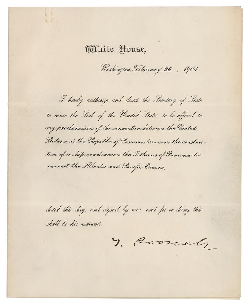 DS as president, signed “T. Roosevelt,” one page, 8 x 10, February 26, 1904. President Theodore Roosevelt authorizes and directs “the Secretary of State to cause the Seal of the United States to be affixed to my proclamation of the convention between the United States and the Republic of Panama to insure the construction of a ship canal across the Isthmus of Panama to connect the Atlantic and Pacific Oceans.” Signed boldly at the conclusion by Roosevelt. In fine condition, with a small paperclip impression to the top edge. Accompanied by a Pach Bros. portrait of Roosevelt from 1900, and by a stapled 19-page booklet containing the proclamation for the “Convention Between the United States and the Republic of Panama for the Construction of a Ship Canal to Connect the Waters of the Atlantic and Pacific Oceans.”
