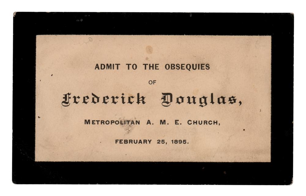 Rare black-bordered 4 x 2.5 admission card for the funeral services of Frederick Douglass, which reads: “Admit to the Obsequies of Frederick Douglass, Metropolitan A. M. E. Church, February 25, 1895.” In fine condition. Douglass died of a heart attack at his home on Cedar Hill in Anacostia, Washington, D.C., after attending a meeting of the National Council of Women. His funeral took place on February 25, 1895, at the Metropolitan African Methodist Episcopal Church and was attended by thousands of the most prominent members of both white and African-American Washingtonian society, including Susan B. Anthony, Senator John Sherman, Supreme Court Associate Justice John Marshall Harlan, Blanche Kelso Bruce, John R. Lynch, and John Francis Cook, Jr.